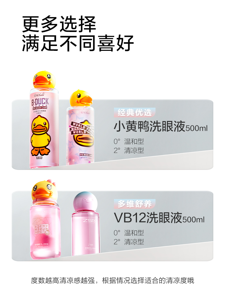 500ml 1.深層清潔眼部灰塵、眼妝殘留、蛋白沉淀等異物。 2.添加維生素B12、海藻糖、牛磺酸等營養(yǎng)成分,水潤滋養(yǎng)眼部 3.pH值、滲透壓接近淚液,溫和洗眼,不刺激眼睛。 4.兩種清涼度可選,自由選擇合適的清涼度。 5.小黃鴨外包裝升級,解鴨加倍