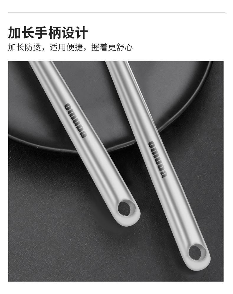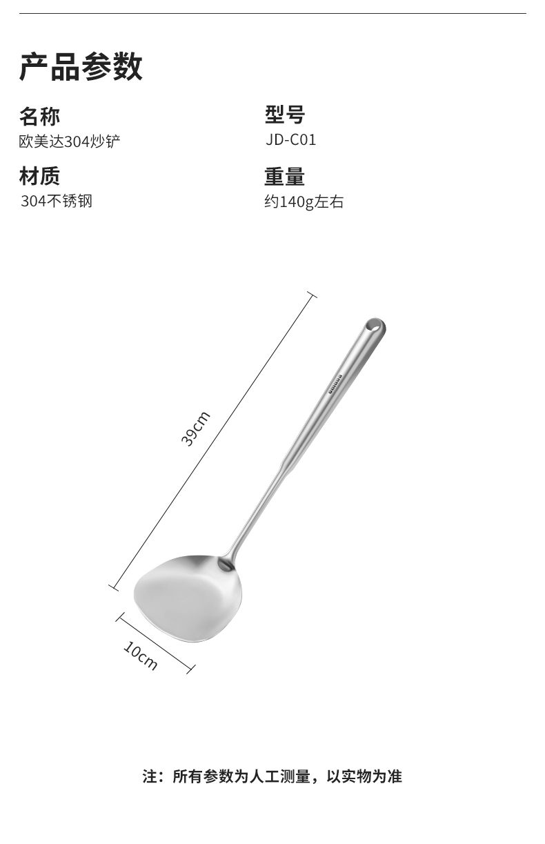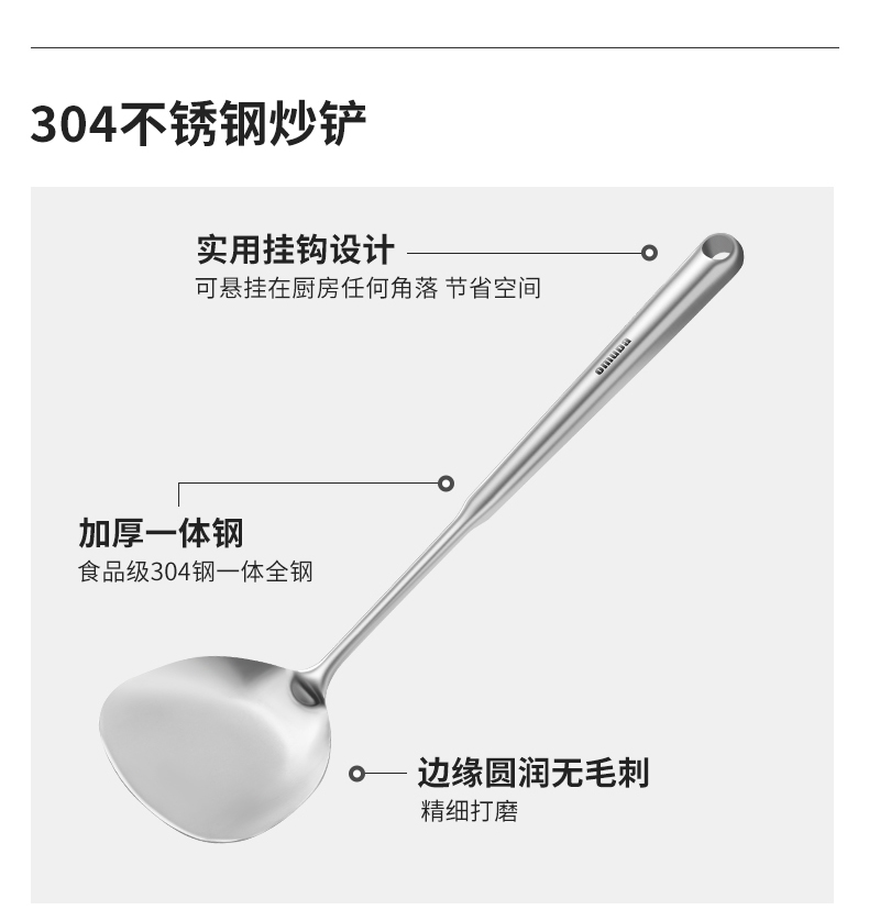 尺寸:39cm 材質(zhì):304不銹鋼 凈重:0.14kg ①采用優(yōu)質(zhì)304不銹鋼材質(zhì),堅(jiān)固耐用,人體工程學(xué)手柄設(shè)計,防熱隔燙,手感更舒適 ②選砂光工藝處理,不易產(chǎn)生刮痕,圓筒狀手柄便于抓握,帶給您便捷的烹飪體驗(yàn) ③整體不銹鋼材質(zhì),易清潔,無衛(wèi)生死角,耐腐蝕、安全衛(wèi)生